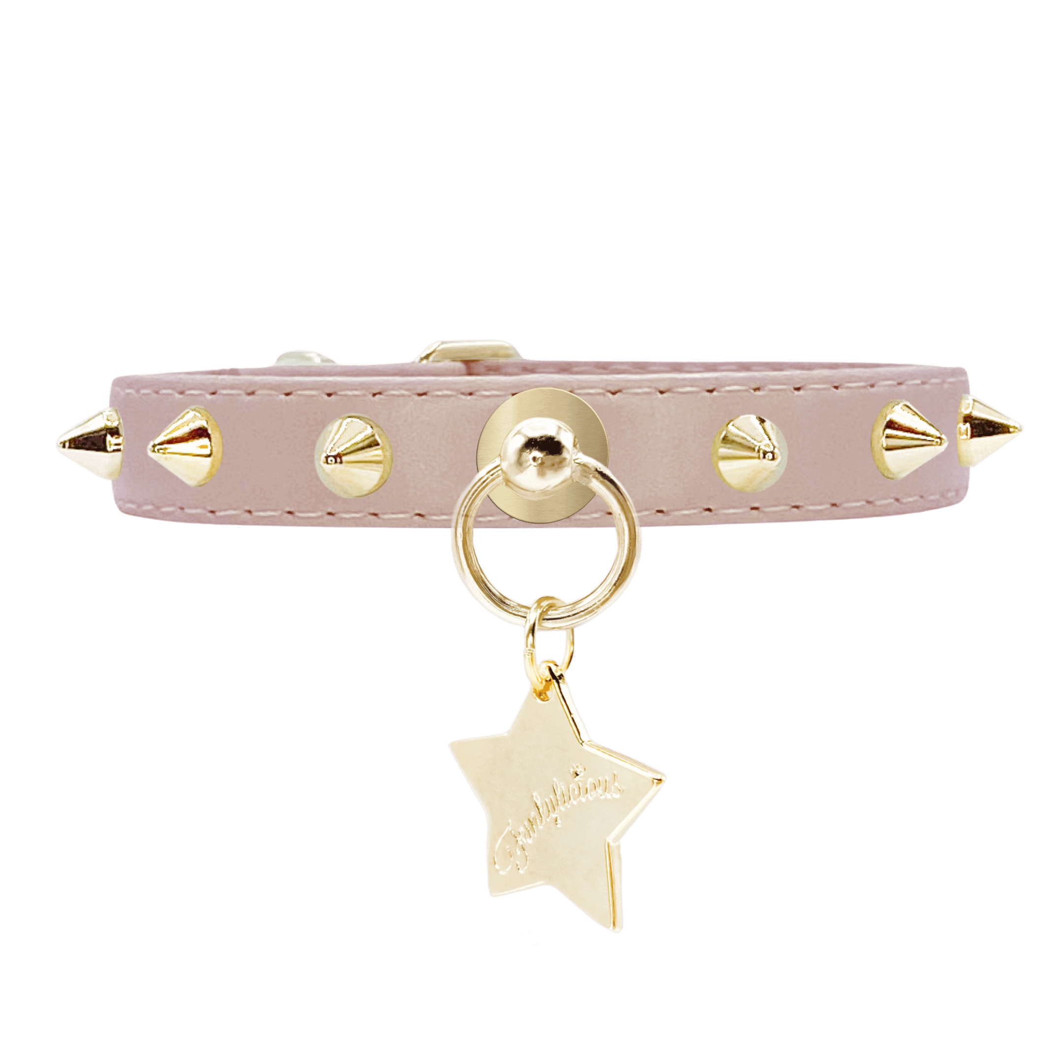 El collar Baby Punk está realizado en eco-piel tipo napa muy suave y resistente y decorado con pinchos acrilicos dorados muy seguros y que no pesan nada.
